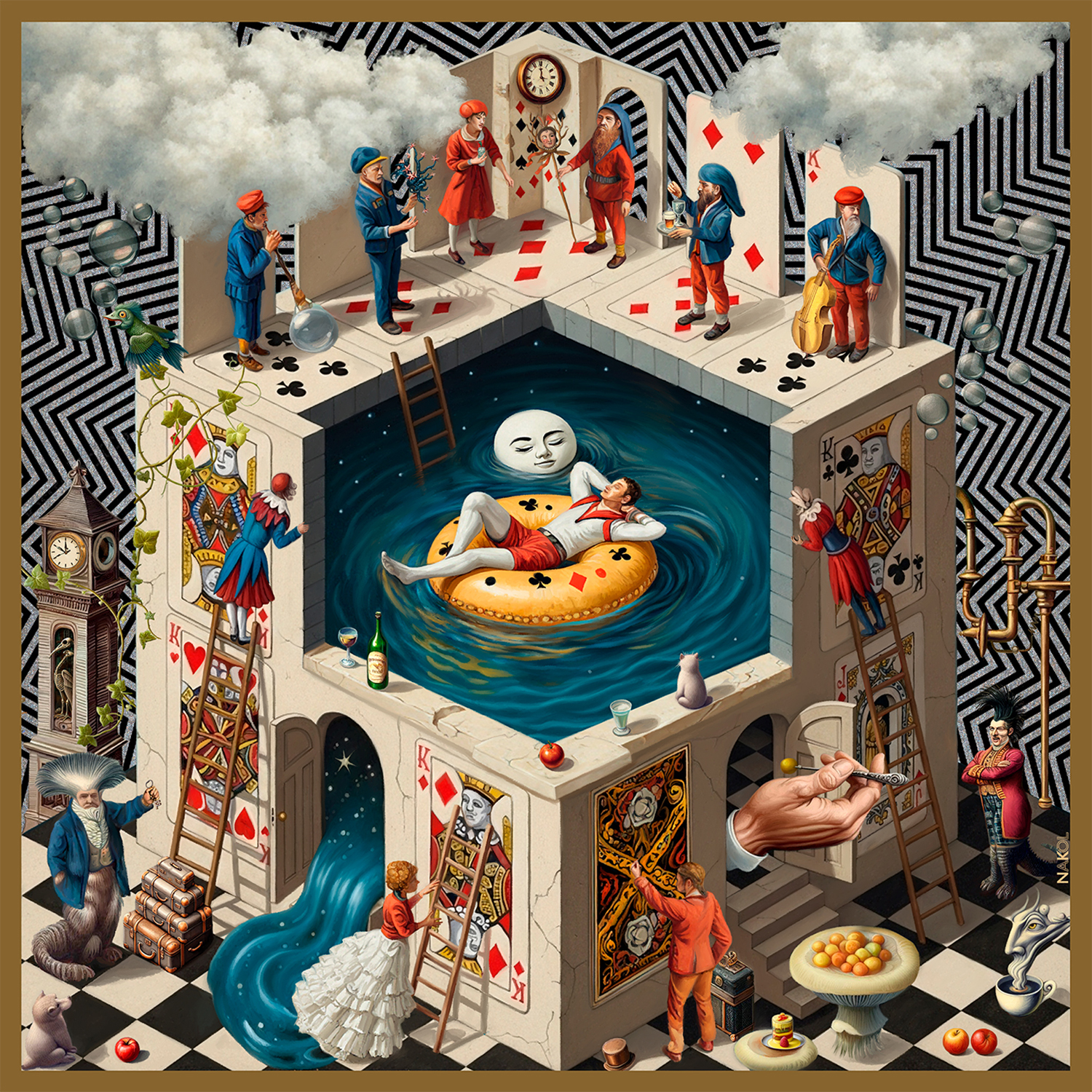 House of Cards is a narrative silk print by Natalia Kolpakova, depicting an impossible card-built architecture containing a central pool where a relaxed figure drifts in orbit of kings and queens. Blending surrealism, symbolism, and poetic references to fate and divination, this 100x100 cm silk scarf functions as both a luxurious wearable artwork and a collectible piece suited for framing and display in curated interiors.