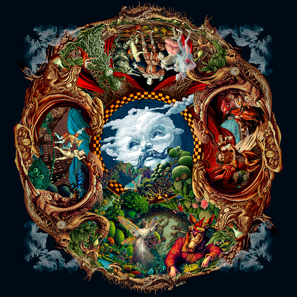 a celestial face in the clouds observes the unfolding scenes—a visual metaphor for
