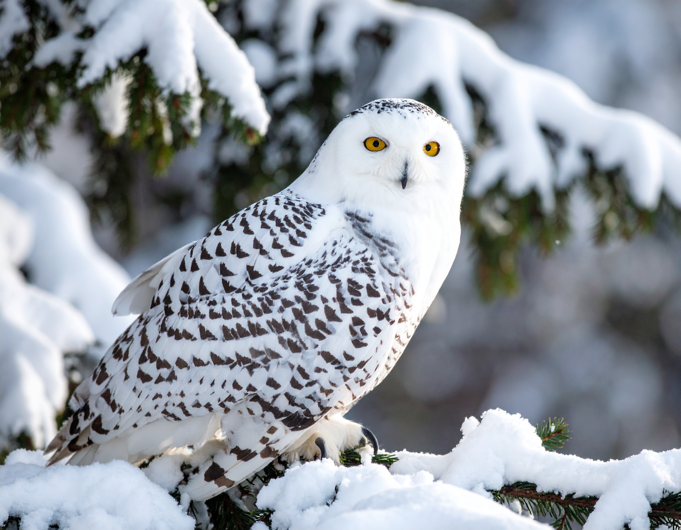 The work portrays a snowy owl perched on a tree branch in the stillness of winter. Its white plumage blends with the surrounding snow, while its focused gaze adds a calm yet powerful presence. The moment feels suspended, as if the northern landscape were breathing softly./ photography